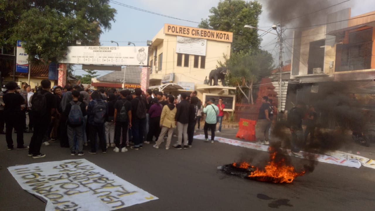 CIREBON,– Dewan Pimpinan Cabang (DPC) Perhimpunan Mahasiswa Hukum Indonesia (Permahi) Cirebon Raya, dan perwakilan Mahasiswa Swadaya Gunung Jati Kota Cirebon berkolaborasi mendatangi Polres Cirebon Kota dengan membakar ban sepeda motor.