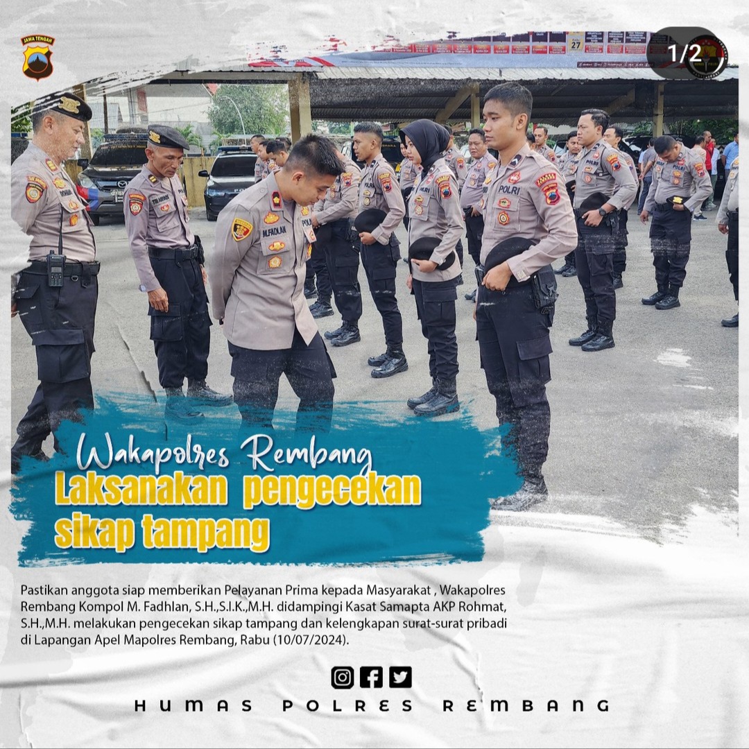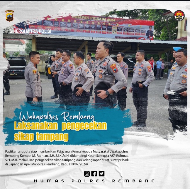 Rembang, Jawa Tengah — Pastikan Anggota siap memberikan pelayanan prima kepada Masyarakat, Wakapolres Rembang Kompol M. Fadhlan, S.H.,S.I.K.,M.H. didampingi Kasat Samapta AKP Rohmat, melakukan pengecekan sikap penampilan dan kelengkapan surat-surat pribadi dilapangan Apel Mapolres Rembang. Rabu, ( 10/07/2024 ).