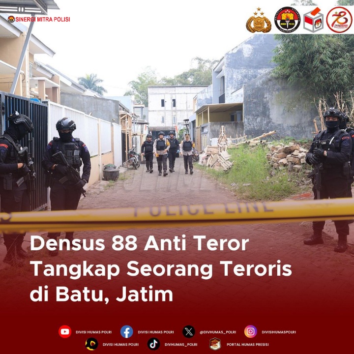 Jakarta — Densus 88 Antiteror Polri berhasil mengamankan terduga teroris berinisial HOK (19) di Kelurahan Sisir, Kota Batu, Jawa Timur, Rabu (31/7) malam.
