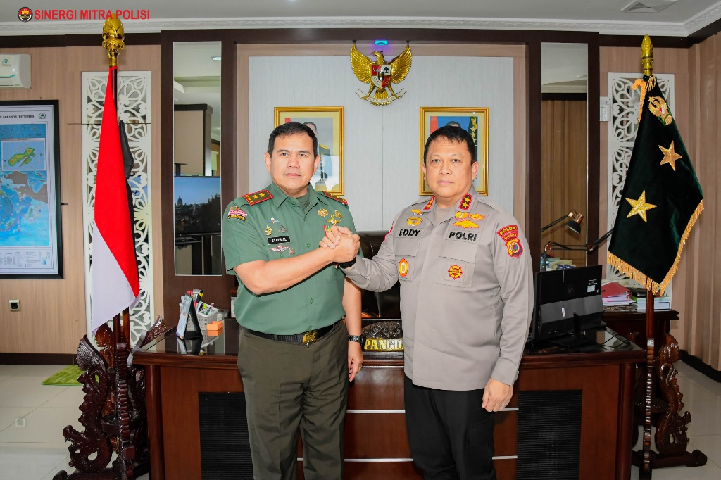 sibaygroupkomunika/ Maluku,- Pangdam XV/Pattimura Mayjen TNI Syafrial, PSC., M. Tr (Han)., menerima kunjungan silaturahmi dari Kapolda Maluku, Irjen Pol Drs. Eddy Sumitro Tambunan, M.Si., diruang kerjanya, Senin, (12/8/2024).