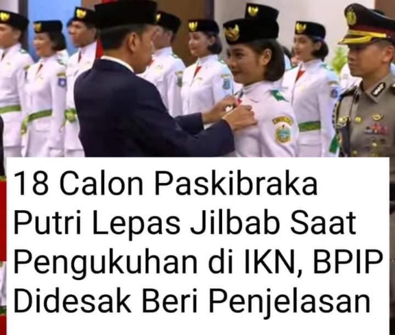 sibaygroupkomunika/ Jakarta,- Pengurus Pusat Purna Paskibraka Indonesia (PPI) menyayangkan adanya 18 calon paskibraka putri tingkat nasional yang lepas jilbab saat pengukuhan di Ibu Kota Nusantara (IKN) pada Selasa (13/8/2024). Ketua Umum (Ketum) PPI Gousta Feriza meminta Badan Pembinaan Ideologi Pancasila (BPIP) selaku pengelola dan penanggung jawab program Paskibraka memberikan klarifikasi.
