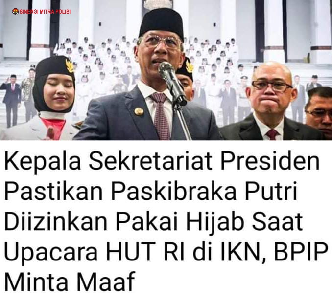 sibaygroupkomunika,- Setelah ramainya pemberitaan terkait anggota Pasukan Pengibar Bendera Pusaka (Paskibraka) 2024 tidak diizinkan untuk mengenakan jilbab saat pengukuhan oleh Presiden Joko Widodo maupun di hari H pelaksanaan upacara, Kepala Sekretariat Presiden (Kasetpres) Heru Budi Hartono menegaskan Paskibraka tetap mengenakan jilbab ketika upacara HUT ke-79 RI di Ibu Kota Nusantara (IKN) sebagaimana mereka mendaftar.