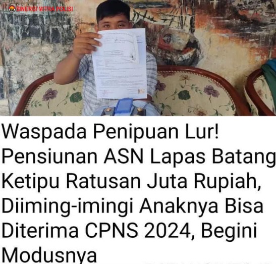 sibaygroupkomunika/ Batang,- Seorang pensiunan ASN Lembaga Pemasyarakatan (Lapas) Kelas II B Batang mengaku ketipu temannya sendiri. Ia diiming-imingi kalau anaknya bisa keterima Calon Pegawai Negeri Sipil (CPNS) di lingkungan Kementerian Hukum dan Hak Azasi Manusia (Kemenkumham).