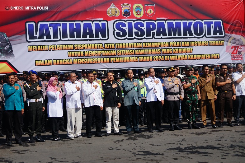 sibaygroupkomunika/ PATI– Sekretaris Daerah Kabupaten Pati Jumani menghadiri Simulasi Sistem Pengamanan Kota (Sispamkota) yang digelar Polresta Pati, Rabu (21/8).