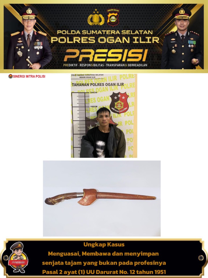 Berdasarkan hasil pemeriksaan sementara, tersangka tidak memiliki profesi yang mengharuskannya membawa senjata tajam, sehingga tindakan tersebut melanggar Pasal 2 ayat (1) Undang-Undang Darurat No. 12 Tahun 1951 tentang larangan membawa senjata tajam tanpa izin. “Tersangka dan barang bukti sudah kami amankan di Polres Ogan Ilir untuk pemeriksaan lebih lanjut,” tambah AKP Ilham.