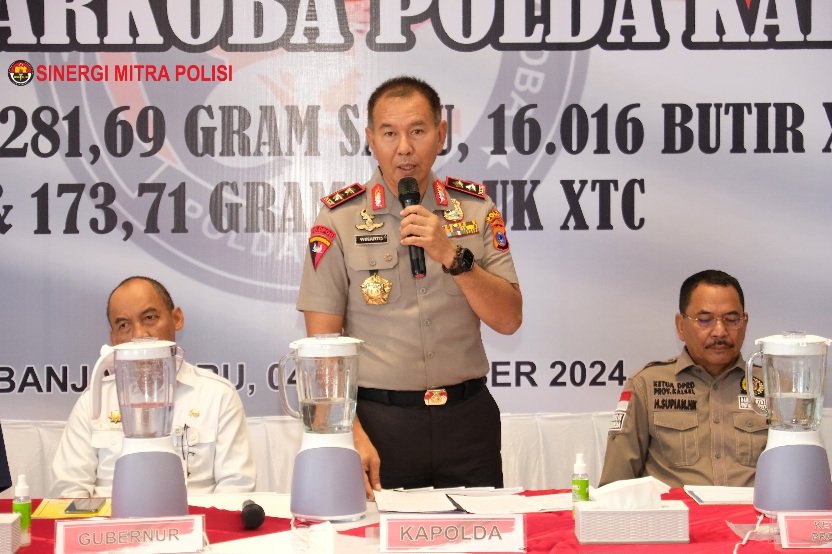 Kapolda menyampaikan bahwa selama tahun 2024 ini, Polda Kalsel telah memusnahkan barang bukti narkotika berbagai jenis meliputi Sabu 72.334,68 gram, XTC 6.204 butir, Serbuk XTC 346,28 gram, Ganja 824,03 gram, Dextro 600 botol, Trihexyphenidyl 700 butir, Kosmetik Qianyan 4 koli, dan Rokok tanpa cukai 60 koli.