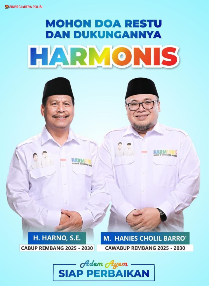 Untuk itu, niat baik Paslon Bupati Harmonis harus kita dukung, karena kita yakin dan percaya di kepemimpinan Harno dan Hanies nanti, Insyallah Kabupaten Rembang akan semakin baik dan tentunya kesejahteraan Masyarakat adalah tujuan utama mereka.