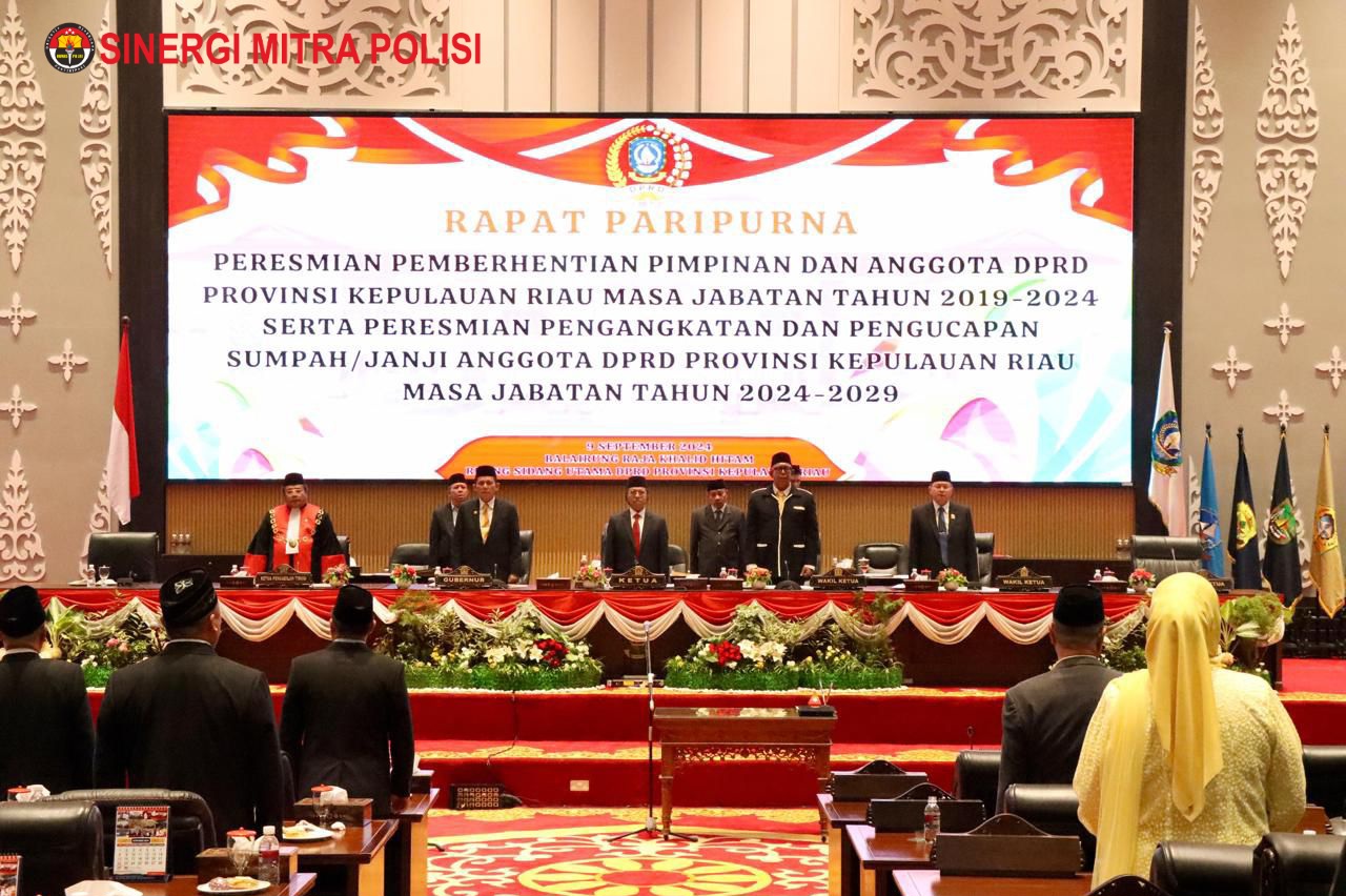 sibaygroupkomunika/ Tanjungpinang,Kepri – Polda Kepulauan Riau memastikan keamanan dan kelancaran acara peresmian pemberhentian dan pengangkatan serta pengucapan sumpah/janji Anggota DPRD Provinsi Kepulauan Riau masa jabatan 2019-2024 dan 2024-2029 yang digelar di kantor DPRD Provinsi Kepulauan Riau. Senin (9/9/24).
