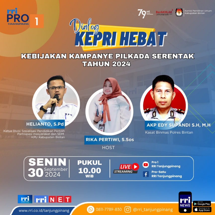 sibaygroupkomunika.com/ Bintan,Kepri,- Dalam rangka menciptakan Pilkada 2024 di Kabupaten Bintan, Polres Bintan bersama KPU laksanakan kegiatan Dialog Kepri Hebat dengan tema Kebijakan Kampanye Pilkada Serentak 2024 yang dilaksanakan di kantor RRI Tanjungpinang pada Senin (30/9/2024).