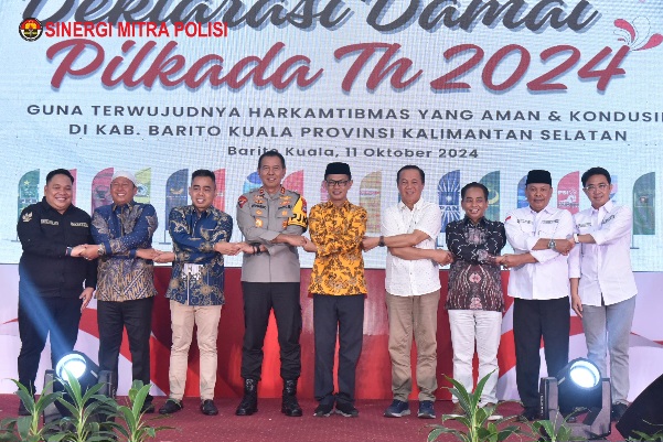 Kepolisian Daerah Kalimantan Selatan (Polda Kalsel) menggelar acara Deklarasi Pilkada Damai tahun 2024 Kabupaten Barito Kuala (Batola). Kegiatan tersebut berlangsung di Aula Jamhuri Aisyah, Jalan Trans Kalimantan, Kelurahan Handil Bakti, Kecamatan Alalak, Kabupaten Batola, Jumat (11/10/2024) malam.