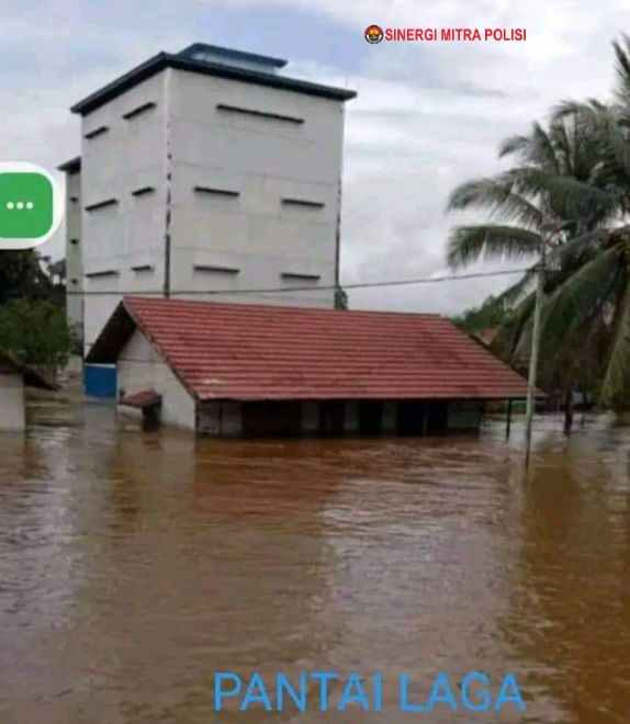 Seperti saat ini di Desa Pantai Laga,air hampir menenggelamkan semua rumah penduduk dan hanya nampak atap rumahnya.info pada tanggal 19/10/2024.