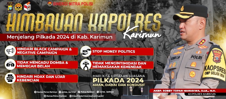 Karimun,Kepri,sibaygroupkomunika.com– Menjelang pelaksanaan Pilkada Serentak 2024, Kapolres Karimun AKBP Robby Topan Manusiwa, S.I.K., M.H. mengeluarkan himbauan penting kepada seluruh masyarakat Kabupaten Karimun. Himbauan tersebut bertujuan untuk mengingatkan masyarakat agar tetap menciptakan suasana pemilu yang aman, damai, dan kondusif.