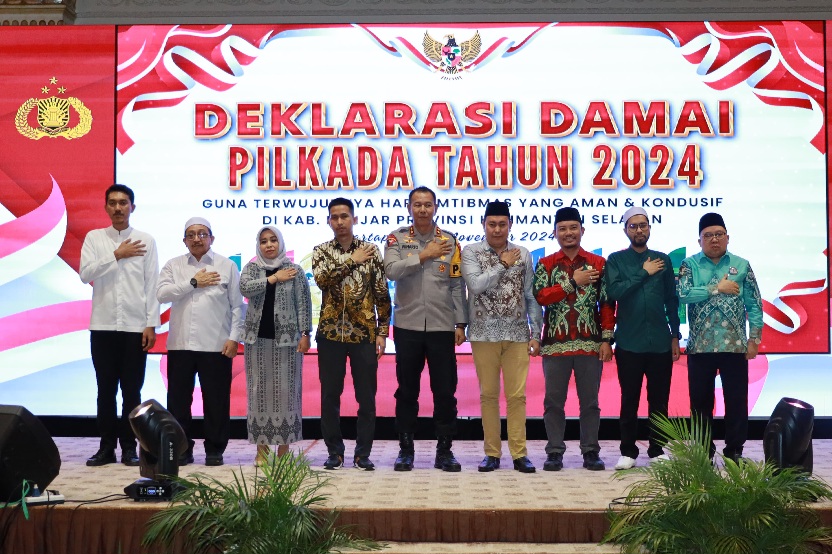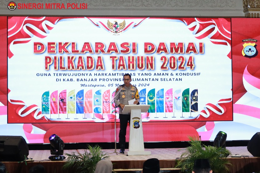 Kepolisian Daerah Kalimantan Selatan (Polda Kalsel) menggelar acara Deklarasi Pilkada Damai 2024 untuk Kabupaten Banjar, yang berlangsung pada hari Selasa (5/11/2024) di Ballroom Hotel Grand Qin, Banjarbaru.