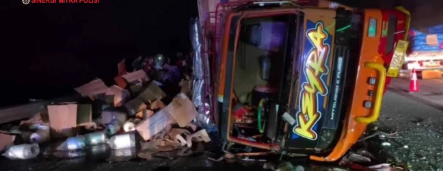 Truk tersebut membawa benang dan terguling setelah ditabrak bus dari belakang.