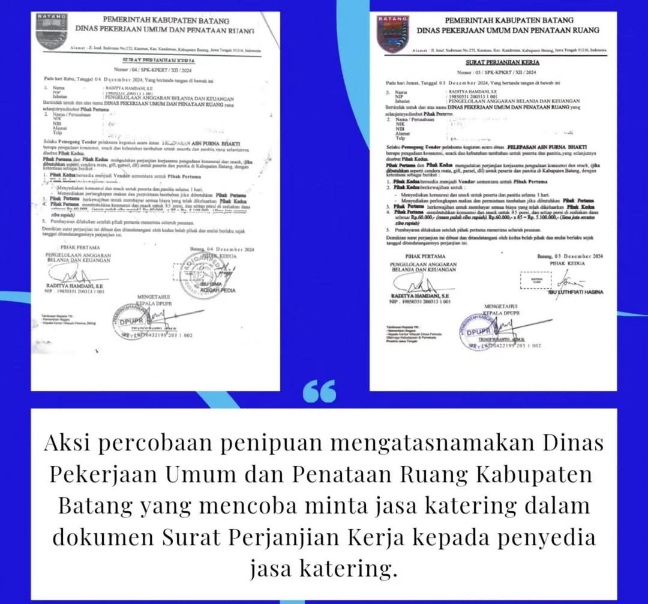 Kronologi awal mula percobaan penipuan pada hari Selasa tanggal 3 Desember 2024 orang dari pihak penyedia katering datang ke DPUPR Kab. Batang dengan maksud mengkonfirmasi kebenaran Surat Perjanjian Kerja yang diterimanya melalui Aplikasi Whatsapp tersebut dari seseorang yang mengaku bernama Raditya Hamdani, SE sebagai Pengelolaan Anggaran Belanja dan Keuangan.