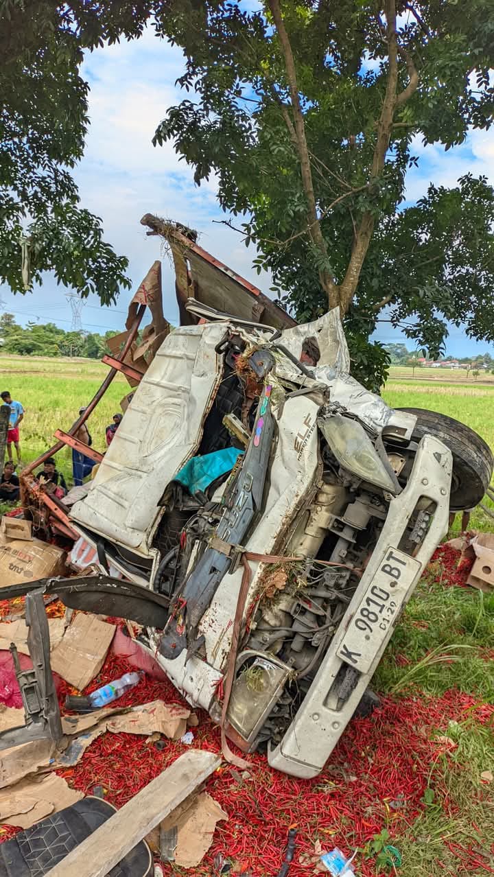 Batang-sinergimitrapolisi.com Kecelakaan tunggal satu unit truk muatan lombok di Tol km 342/400, Truk dengan nopol K-9810-BT, yang dikemudikan oleh saudara Riski, asal Demak, muatan lombok dari Tuban tujuan Palembang, kecelakaan di area km 342/400, Sawahjoho, kec.Warungasem, kab.Batang, pada Selasa, 20 mei 2025, pukul. 05.00 WIB, setelah mengalami pecah ban kiri dan terjun bebas kebawah sedalam 10 meter.
