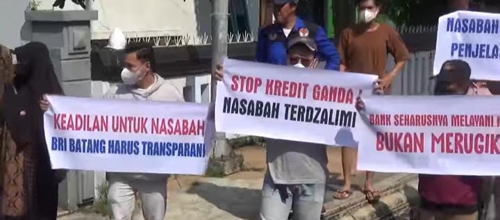 BATANG.-sibaygroupkomunika.com.//Belasan warga kabupaten Batang, Rabu (28/5) siang melakukan aksi di depan kantor bank BRI cabang setempat. Dengan membentangkan sejumlah spanduk, massa yang sebagian merupakan nasabah bank tersebut, ingin menuntut keadilan.