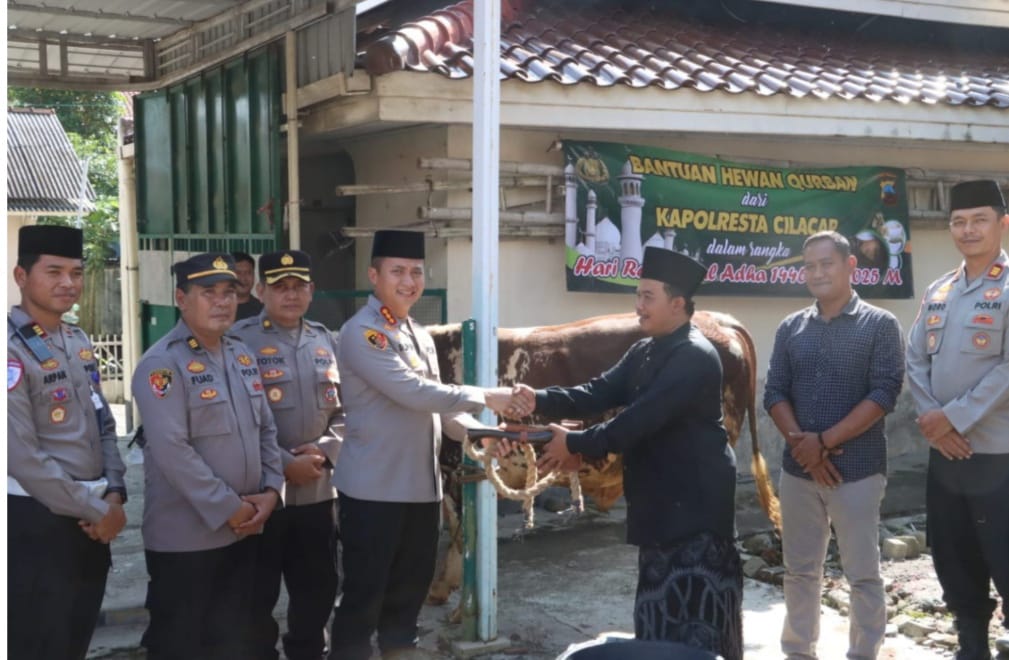 Cilacap.-sibaygroupkomunika.com.//3 Juni 2025 — Menjelang Hari Raya Idul Adha 1446 Hijriah, Kapolresta Cilacap Kombes Pol. Dr. Ruruh Wicaksono, S.I.K., S.H., M.H. menyerahkan secara langsung satu ekor sapi kurban kepada Masjid Agung Darussalam Cilacap pada Selasa (3/6). Sapi dengan bobot kurang lebih 700 kilogram tersebut diserahkan sebagai bagian dari program Polri Peduli Kurban.