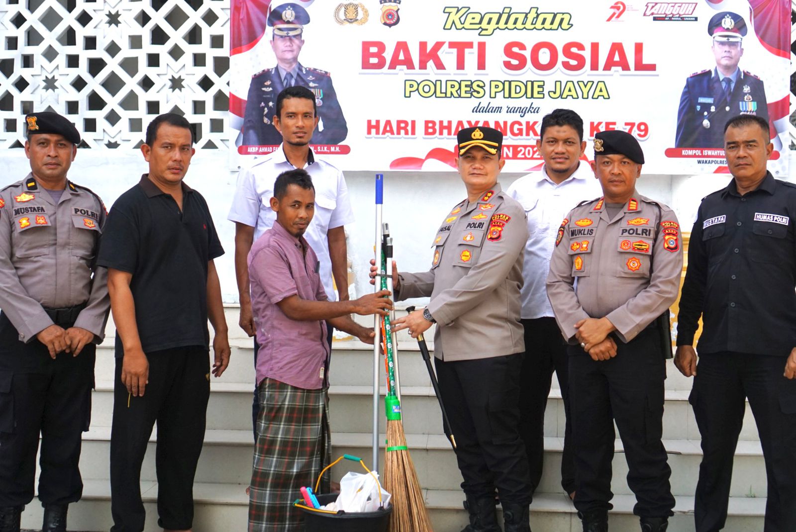 PIDIE JAYA.-sibaygroupkomunika.com.//. Menjelang peringatan Hari Bhayangkara ke-79 tahun 2025, Kepolisian Resor Pidie Jaya menggelar kegiatan bakti sosial di Masjid Pante Geulima, Kecamatan Meureudu, Kabupaten Pidie Jaya, pada Rabu (4/6/2025) pukul 14.00 WIB.