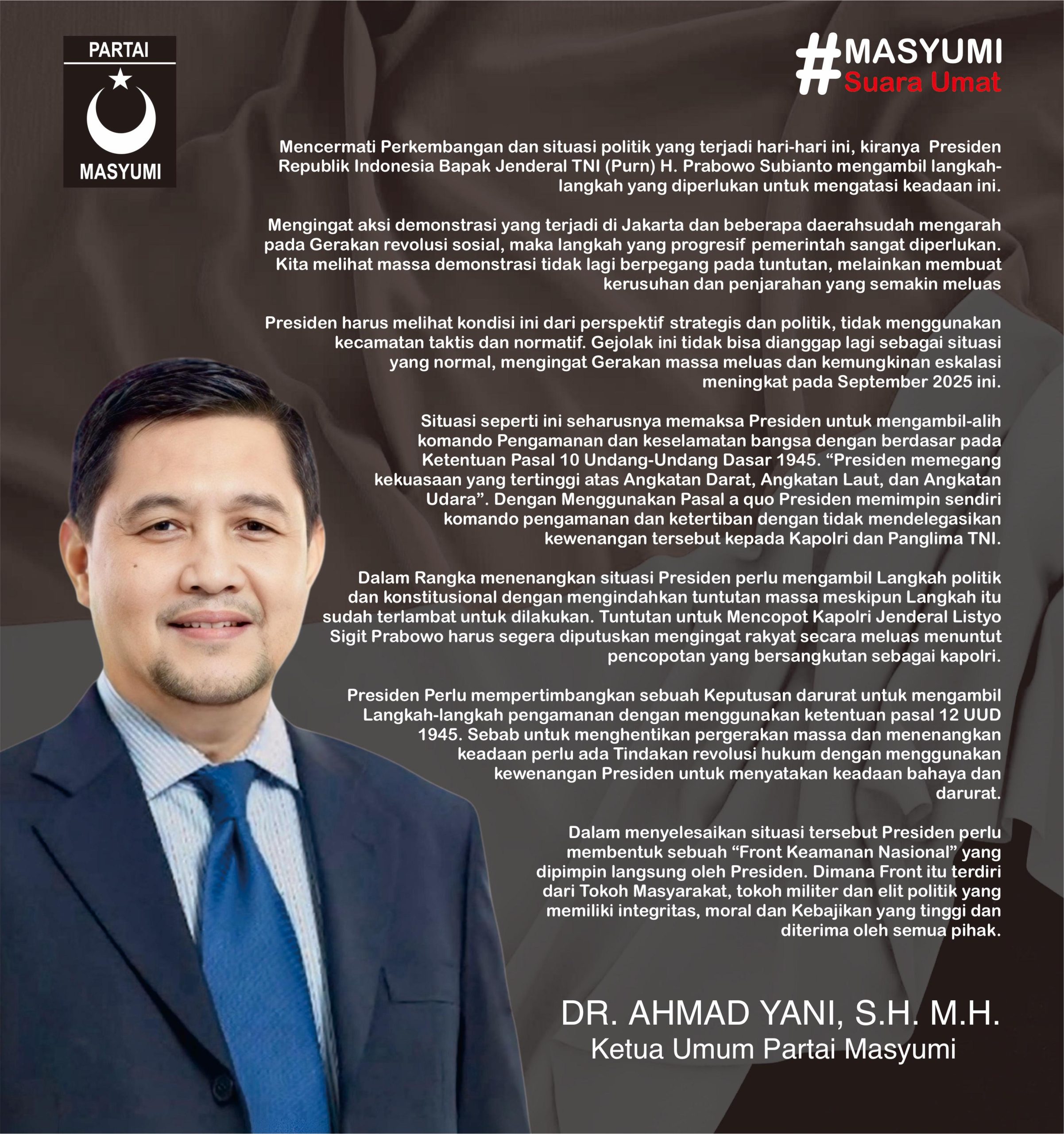 SIBAYGROUPKOMUNIKA.COM.//Jakarta, 31 Agustus 2025 – Menyikapi perkembangan situasi politik dan aksi demonstrasi yang terjadi di berbagai daerah, Ketua Umum Partai Masyumi, Dr. Ahmad Yani, S.H., M.H., mendesak Presiden Republik Indonesia Jenderal TNI (Purn.) H. Prabowo Subianto untuk segera mengambil langkah-langkah tegas dan progresif dalam mengatasi keadaan.