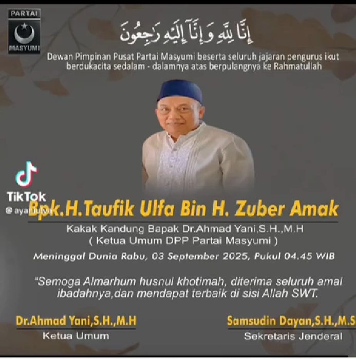 SIBAYGROUPKOMUNIKA.COM.//Jakarta, 3 September 2025 – Keluarga besar Partai Masyumi menyampaikan duka cita mendalam atas wafatnya H. Taufik Ulfa bin H. Zuber Amak, kakak kandung Ketua Umum DPP Partai Masyumi, Dr. Ahmad Yani, S.H., M.H.