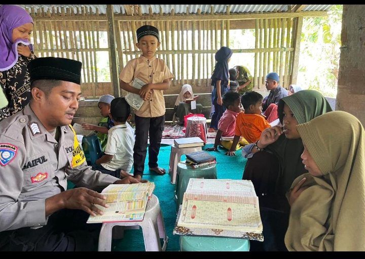 SIBAYGROUPKOMUNIKA.COM.//Sosok anggota Polri yang satu ini patut diacungi jempol, Bhabinkamtibmas Polsek Simpang Jernih, Polres Aceh Timur, Polda Aceh, Bripka Saifullah juga aktif menjadi guru ngaji bagi anak-anak di Desa Simpang Jernih.