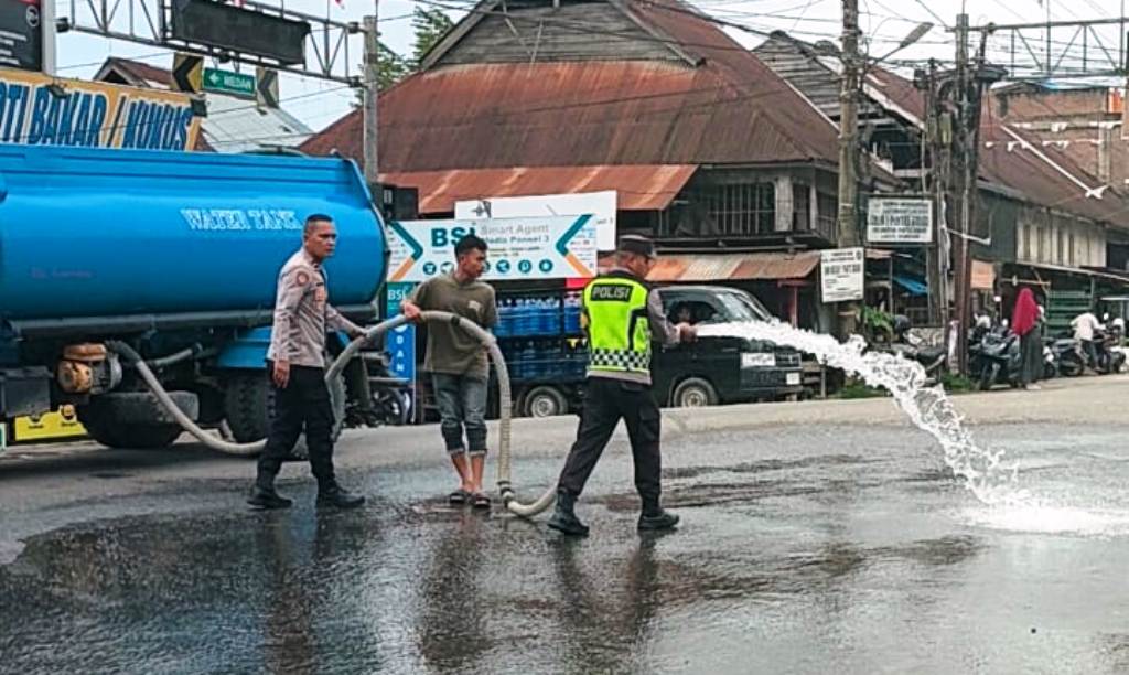 Aksi Cepat dan Tanggap Kapolsek Pantee Bidari Bersihkan Jalan dari Tumpahan BBM dan Oli