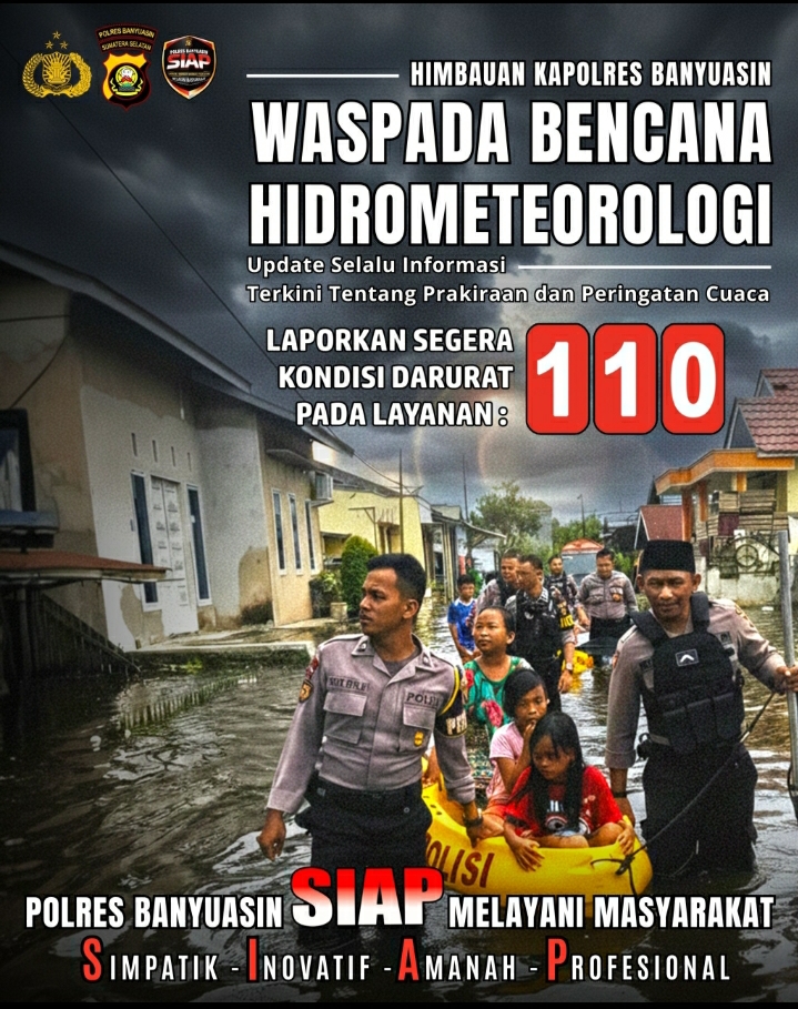 Banyuasin — Kapolres Banyuasin mengimbau seluruh masyarakat Kabupaten Banyuasin untuk meningkatkan kewaspadaan terhadap potensi bencana hidrometeorologi yang dapat terjadi sewaktu-waktu, seperti hujan lebat, banjir, angin kencang, dan tanah longsor.